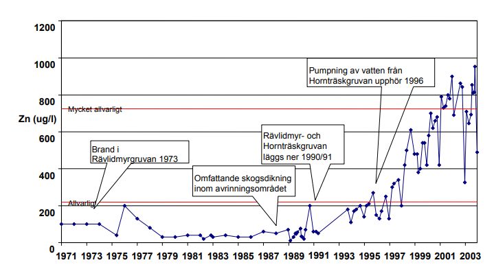 Tässä käppyrää, miten käy kun kaivoksien jälkitoimet pettävät! Vuodot läheiseen järveen lisääntyvät radikaalisesti toiminnan jälkeen. Tässä pelkkä sinkki, mutta myös kupari on ollut yliedustettuna. Yhdessä Hornträsketgruvanin kanssa Rävlidenmyran on ollut osatekijänä viereisen järven saastumiseen erityisesti 90-luvulla ja 2000-luvun alussa.