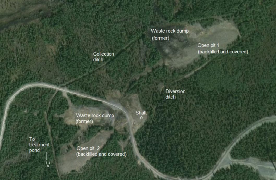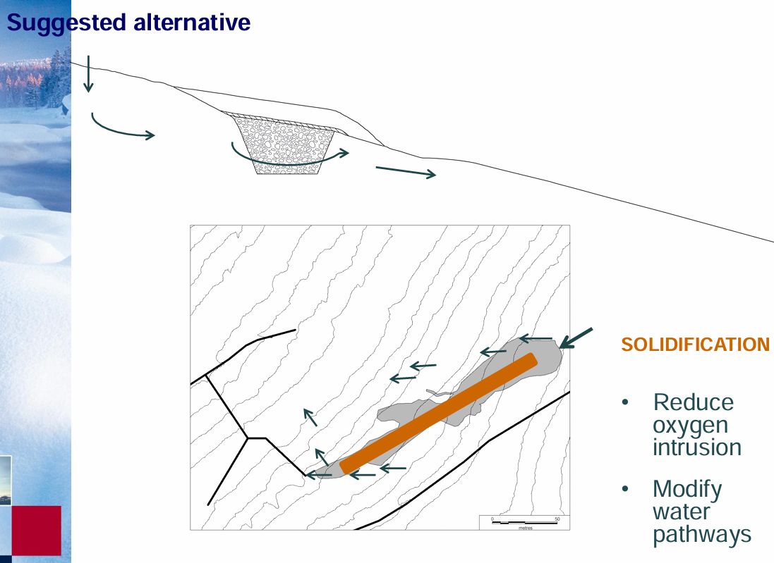 Makean veden ohjaamiseksi louhosten ympäriltä, ja saastuneiden vesien keräämiseksi ja johtamiseksi kalkkikäsittelyä varten Kristinebergin rikastushiekka-altaaseen, alueen ympärille rakennettiin vuonna 1982 ojajärjestelmä. Lisäksi täytettyjen jätekivien päälle rakennettiin kuivapeiterakenne.